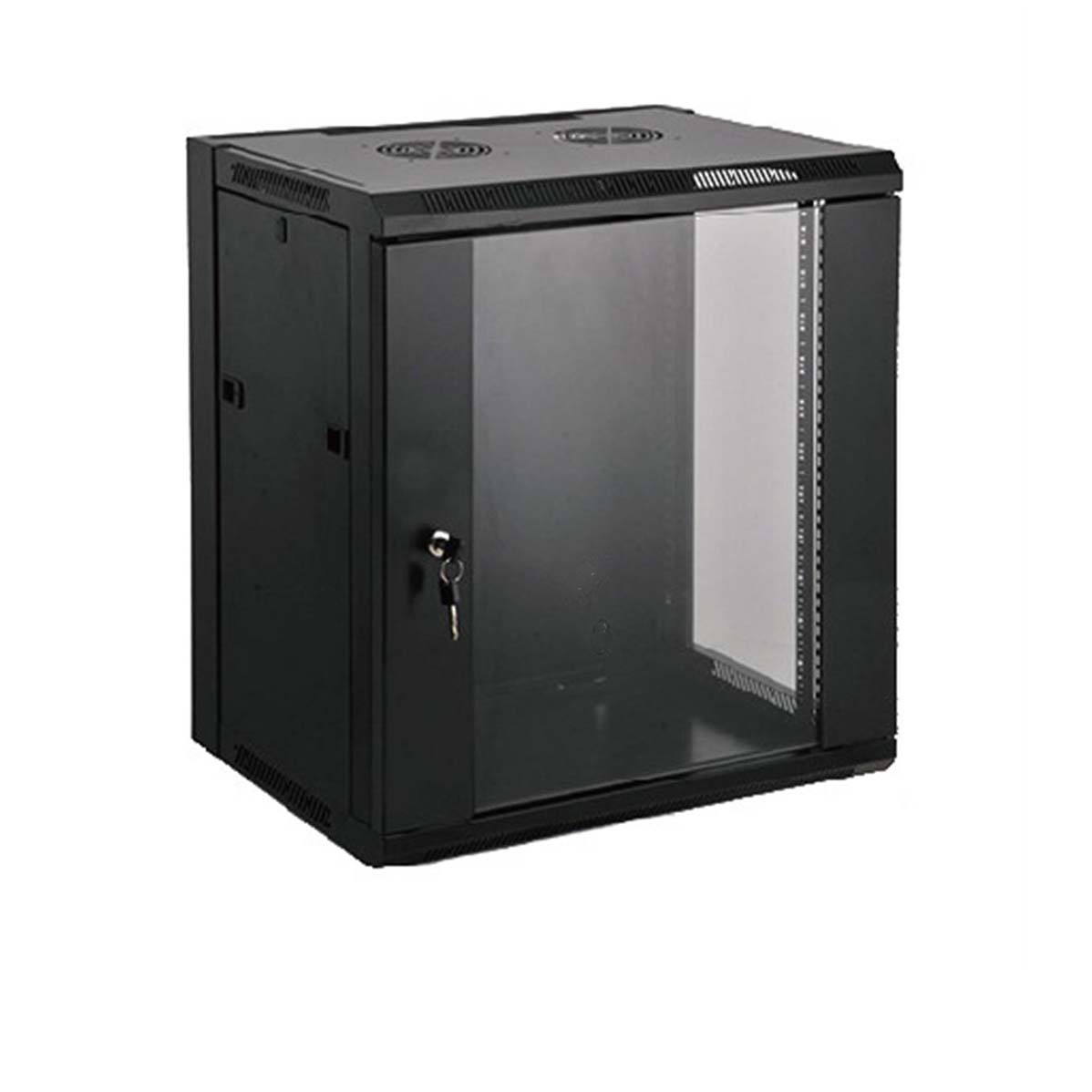Coffret mural GIGANET 19″ avec porte avant vitrée et panneau arrière plein, il est livré démonté et Sans Étagère. Les montants 19″ sont réglables en profondeur et les panneaux latéraux sont amovibles.
