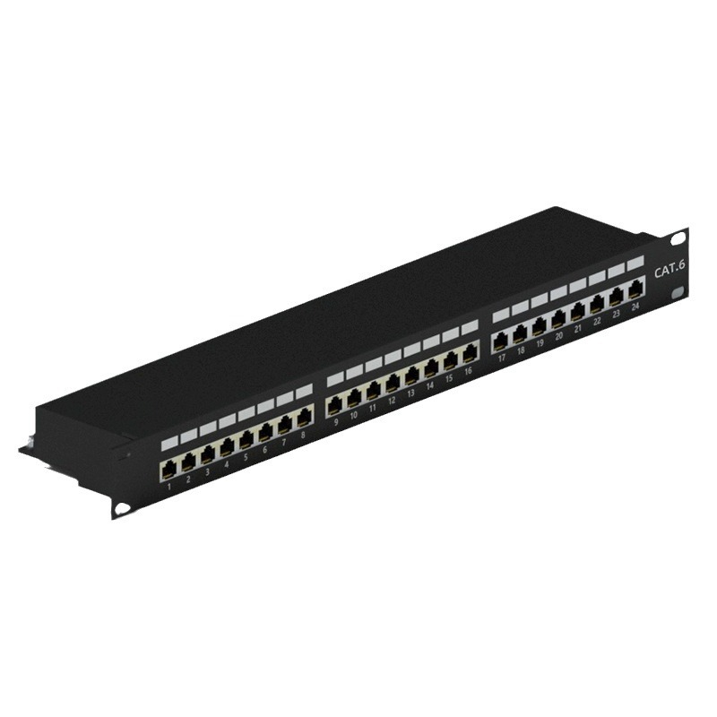 Ce panneau de brassage à monter dans un coffret mural ou une armoire 19 pouces est doté de 24 connecteurs RJ45 Femelle catégorie 6 FTP